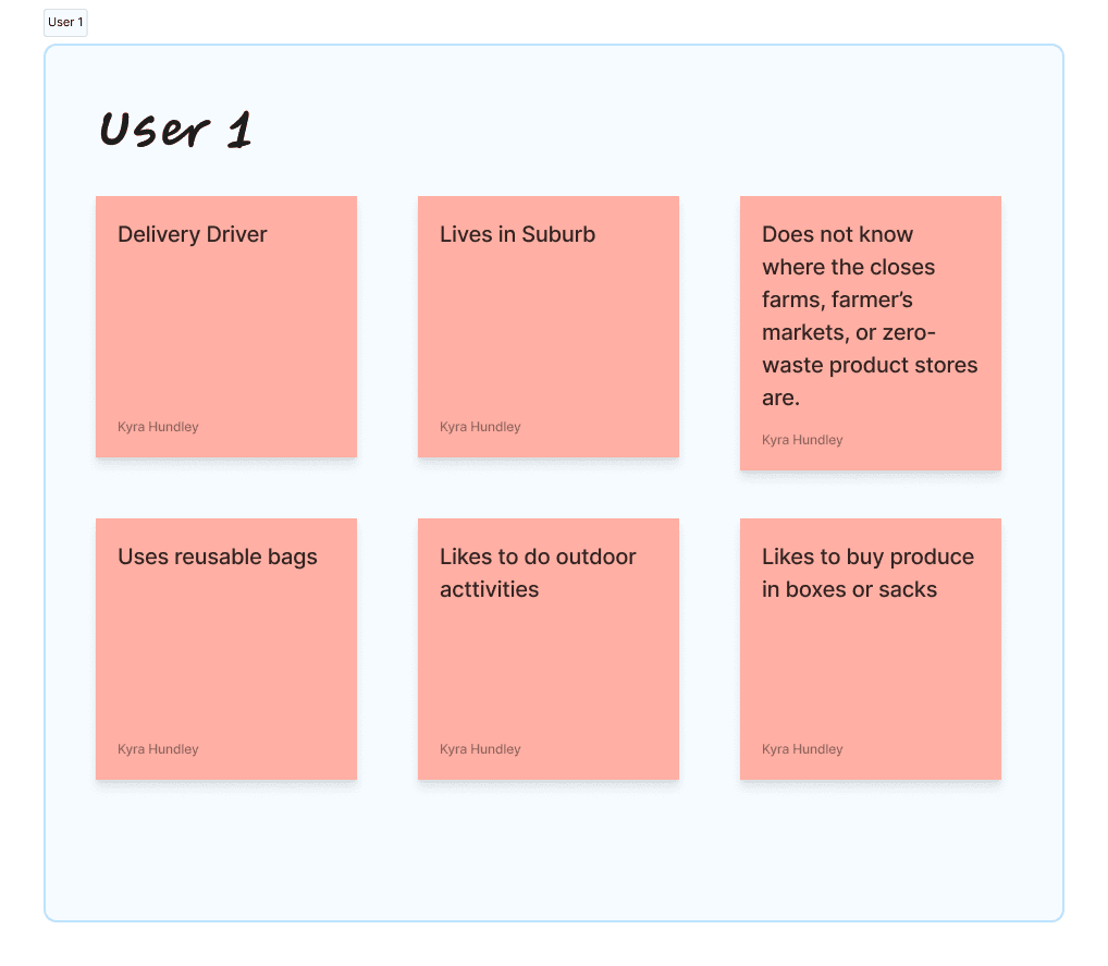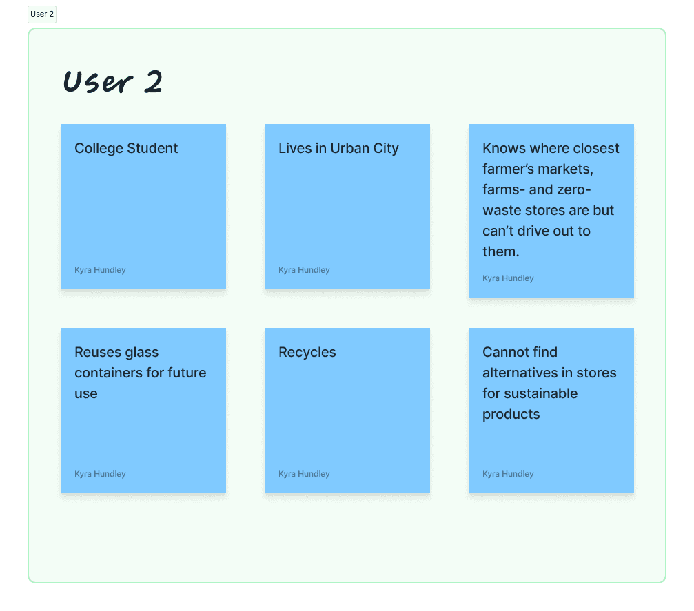 Given the time constraints of the hackathon, a decision was made to consolidate the primary and secondary research findings into a single persona that represents the common challenges and needs identified. The persona is characterized by a busy schedule and a desire for accessible options to obtain farm-to-table and zero-waste products. A key issue for this persona is the inability to drive out to farms due to time constraints. By focusing on these core challenges, I was able to develop solutions that address the persona's specific needs and make sustainable options more attainable within their busy lifestyle.