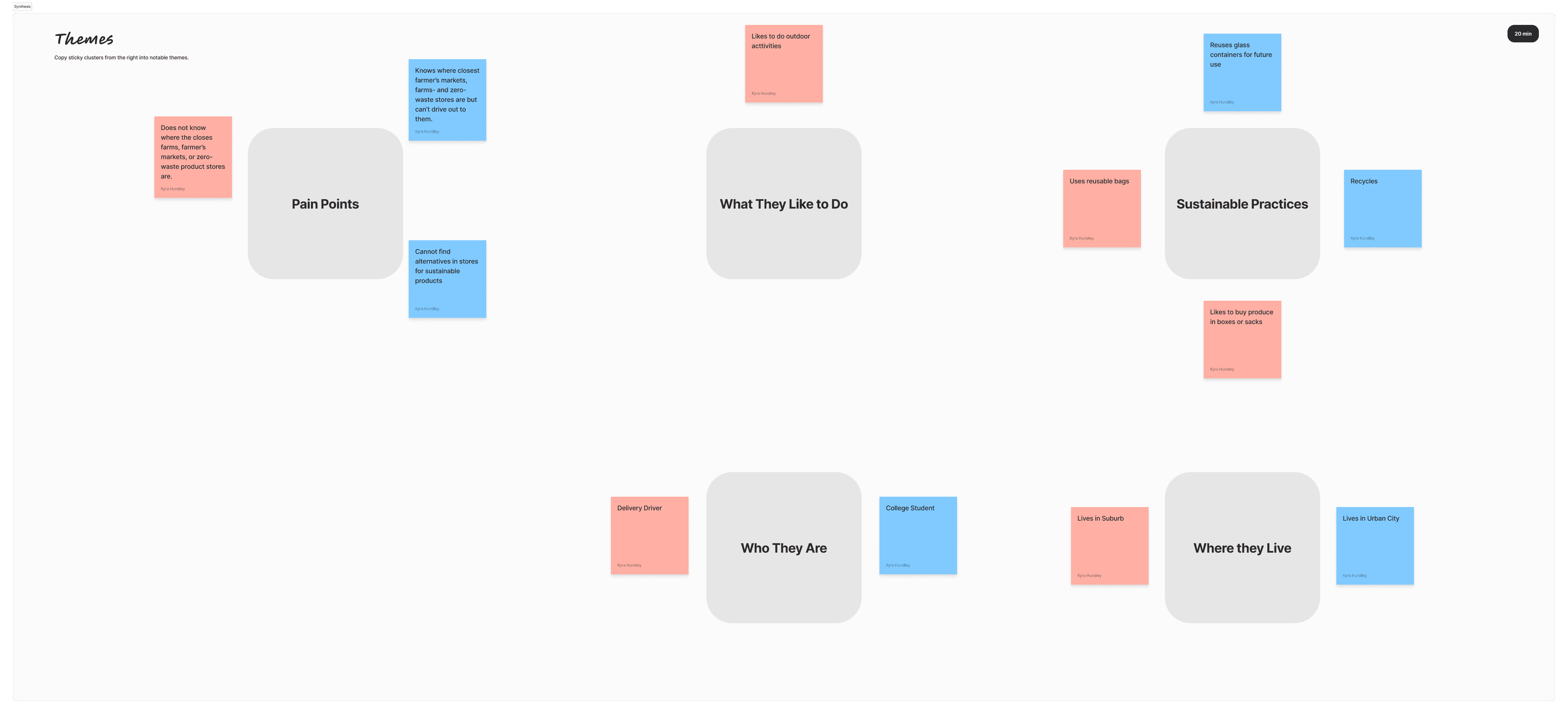 The affinity mapping activity was conducted with the purpose of gaining valuable insights and organizing user data to inform the design process. By analyzing and grouping the collected information into five distinct categories, such as Pain Points, What They Like to Do, Sustainable Practices, Who They Are, and Where They Live, the design team obtained a deeper understanding of the users' needs, preferences, and challenges.