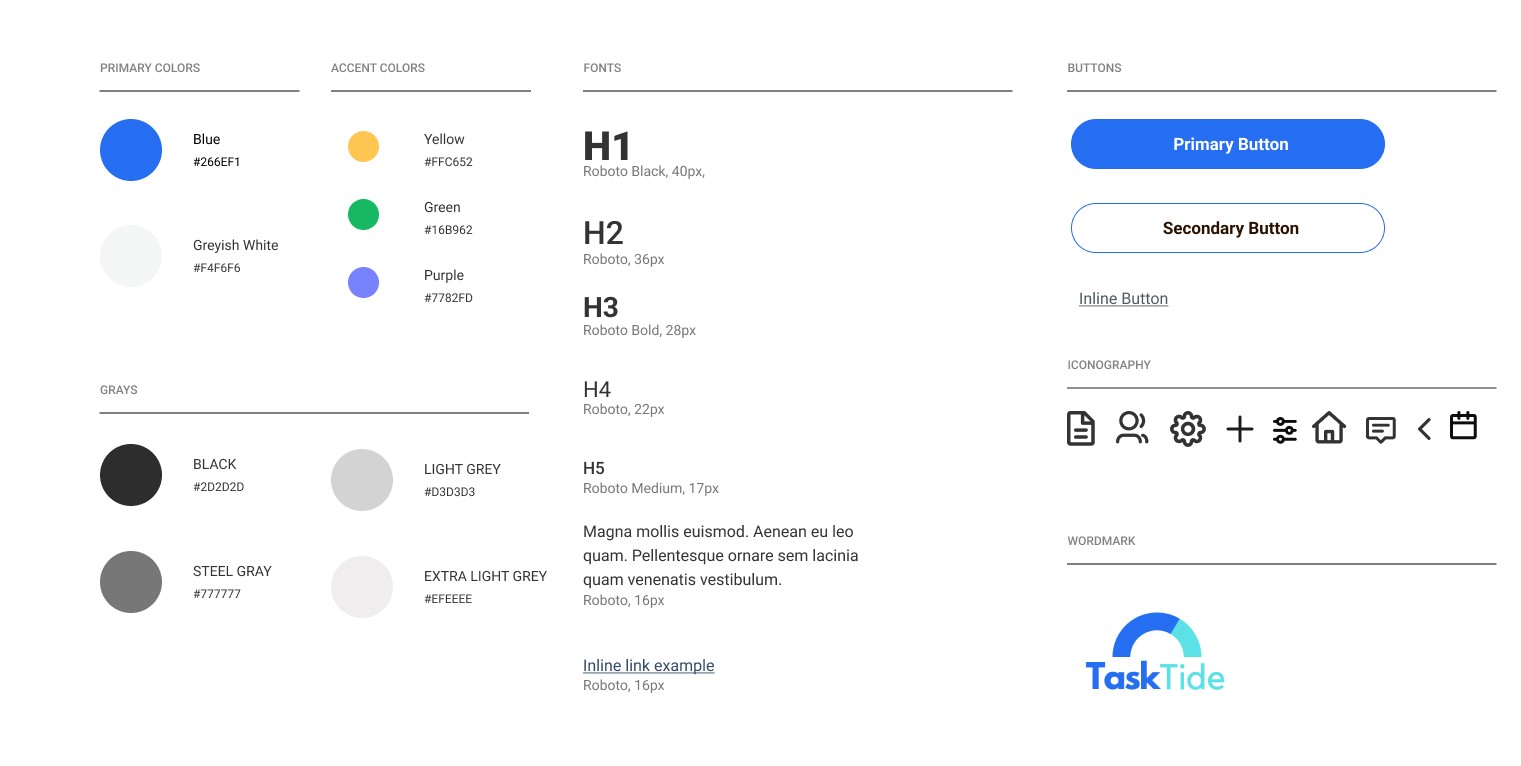 I developed a mood board as a visual representation of the desired look, feel, and aesthetic for TaskTide, following the guidelines of the brand platform. By aligning the design with the brand's personality and attributes, the mood board ensured consistency and coherence in conveying the brand's essence. The goal was to create a calming and positive user experience that resonated with the brand platform, establishing a strong connection between the product and its intended audience.a