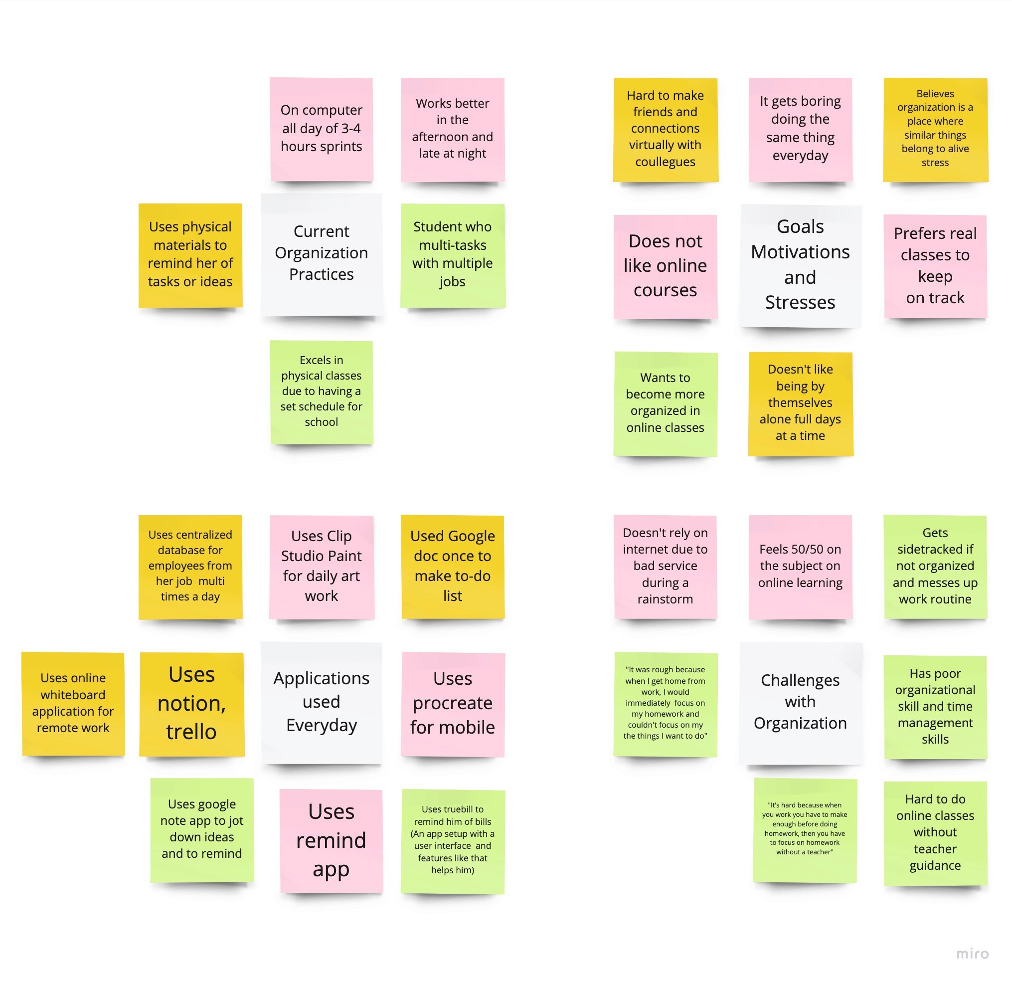 Through my secondary research, I discovered that a significant portion of college students felt that their high school education did not adequately equip them with organizational skills. This lack of organizational skills often results in difficulties in managing their time effectively. As a result, students found it challenging to balance extracurricular activities with their academic responsibilities, leading to decreased productivity and lower grades. Additionally, this lack of organization contributes to feelings of disorganization and makes it difficult for students to identify the necessary tools and resources to support their academic success.