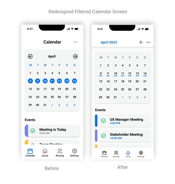 To reduce distraction, the filtered calendar function in the app underwent changes to minimize the prominence of the blue highlights.